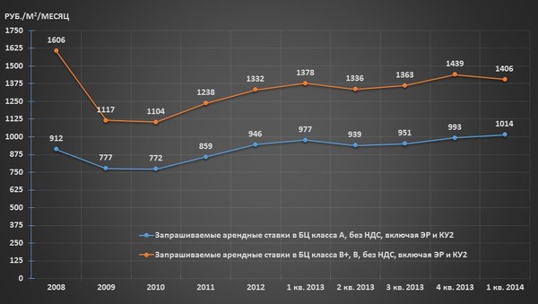 Средние арендные ставки в ТК СПБ в 1 квартале 2014 года, руб. за кв. м в мес., с учетом НДС и дополнительных расходов.